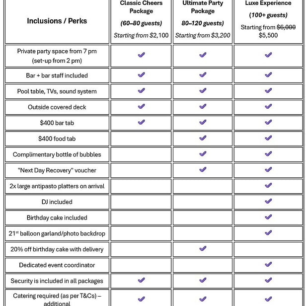 Whether you're after chill vibes or a full-on dance floor, we've got packages to suit. From tasty platters to birthday cakes to banging tunes — we’ll work with you to make it your kind of party.